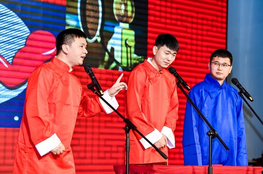 說到未藍(lán)年會(huì)每年經(jīng)典、長盛不衰的節(jié)目,那必然是相聲了。往年都是兩位,今年加入了一位新成員,給我們說了一場(chǎng)《學(xué)電臺(tái)》。不僅形式上有所創(chuàng)新,內(nèi)容更是較往年大不相同,可謂相當(dāng)精彩。戲曲兒小調(diào)一段一段地信手拈來,幽默風(fēng)趣的梗一個(gè)一個(gè)地拋來擲去,好不熱鬧,