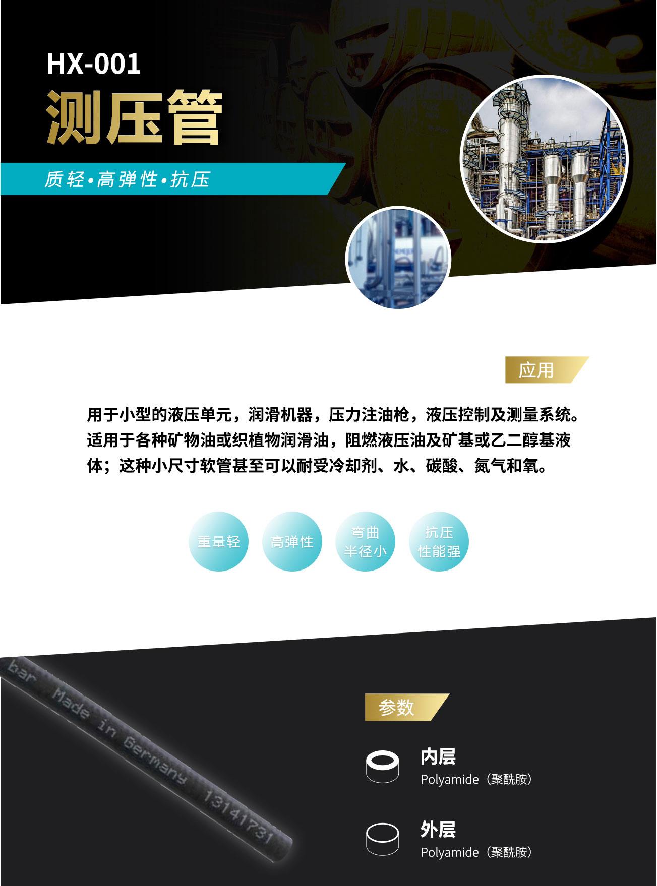 用于小型的液壓單元,潤滑機器,壓力注油槍,液壓控制及測量系統(tǒng)。適用于各種礦物油或植物潤滑油,阻燃液壓油及礦基或乙二醇基液體;這種小尺寸軟管甚至可以耐受冷卻劑、水、碳酸、氮氣和氧。