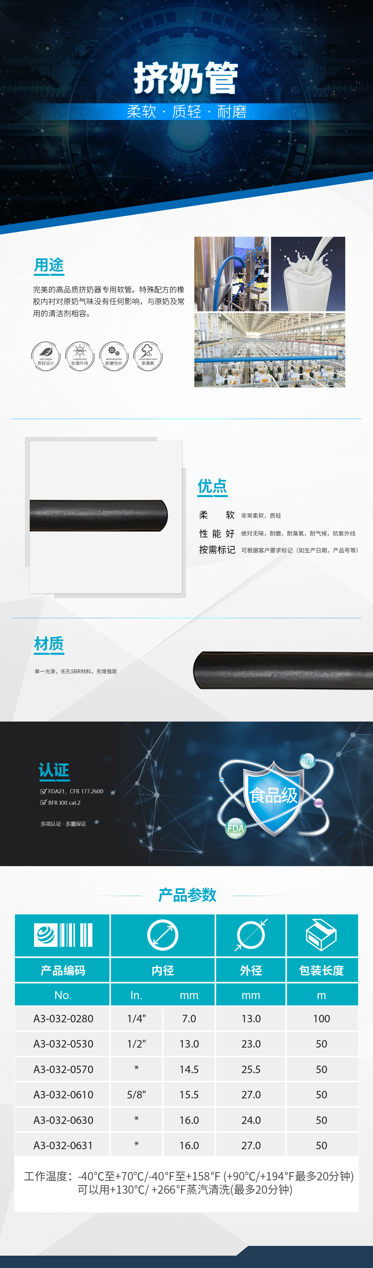 單一光滑,無孔SBR材料,無增強層,對牛奶氣味無影響 耐磨, 耐臭氧,耐氣候,UV