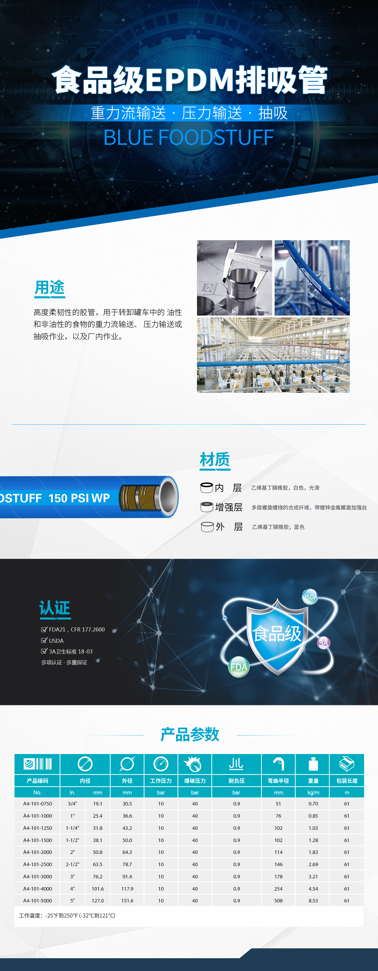 高度柔韌性的膠管,用于轉(zhuǎn)卸罐車中的油型和非油型食物的重力流輸送、壓力輸送或抽吸作業(yè),以及廠內(nèi)作業(yè)。