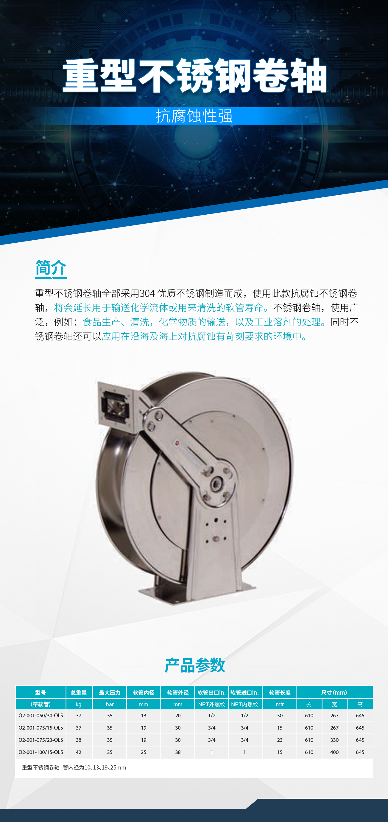 • 不銹鋼卷軸全部采用美國304級優(yōu)質不 銹鋼制造而成,使用銳技抗腐蝕不銹鋼卷軸,將會延長用于輸送化學流體或用來清洗的軟管的壽命。通過合理的存放 不使用的軟管,可以減少由于軟管存放雜亂無序引起的絆倒事故,同時改善工作環(huán)境。不銹鋼卷軸使用范圍廣泛, 例如:食品生產、清洗,化學物質的輸送,以及工業(yè)溶劑處理。同時不銹鋼卷軸還可應用在沿海和海上對抗腐蝕有苛刻要求的環(huán)境中。旋轉接頭使用 Viton“O”型圈。