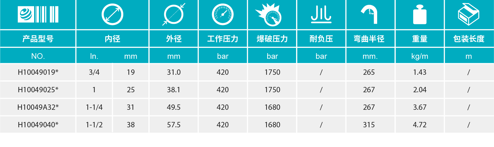 • 【增強(qiáng)層】:4層高抗拉鋼絲纏繞(DN19-25) 6層高抗拉鋼絲纏繞(DN31-38)