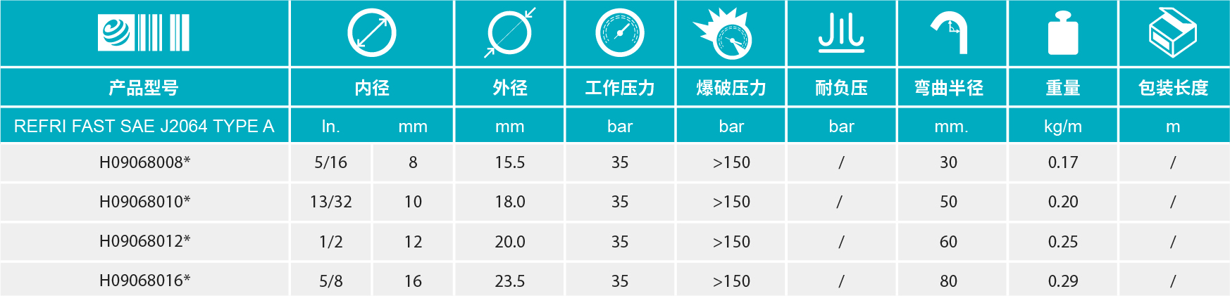 • A型膠管中更緊湊的尺寸更小,與縮小絕緣層的軟管相比,外徑也相對更小 重量輕 在空間狹小處便于安裝 高柔軟度小彎曲半徑 兼容各類制冷劑和潤滑劑 低制冷劑滲透率和水汽侵透率