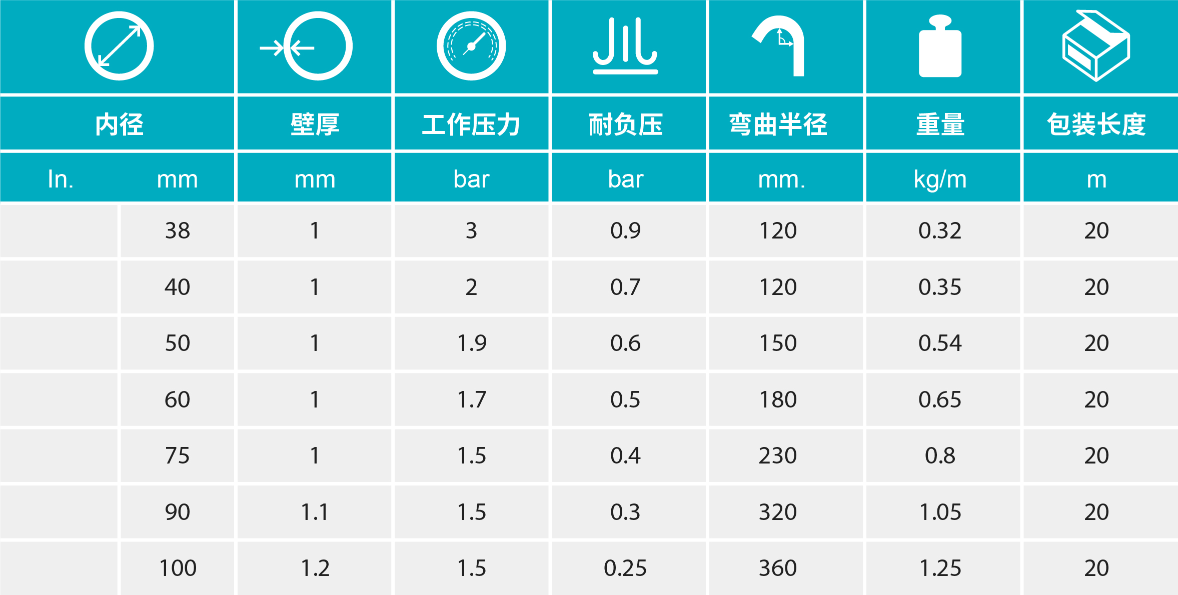 - 質(zhì)極輕且具有良好的柔韌性,內(nèi)壁平滑以保證物料在管內(nèi)流動順暢