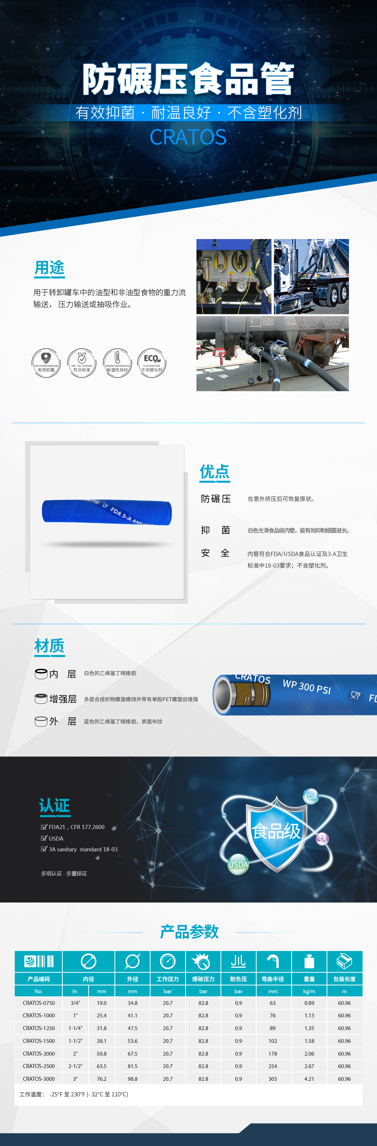 • 柔軟的膠管,具有特殊增強(qiáng)層材料,在意外擠壓后可恢復(fù)原狀,常用于轉(zhuǎn)卸罐車中的油型和非油型食物的重力流輸送,壓力輸送或抽吸作業(yè)。