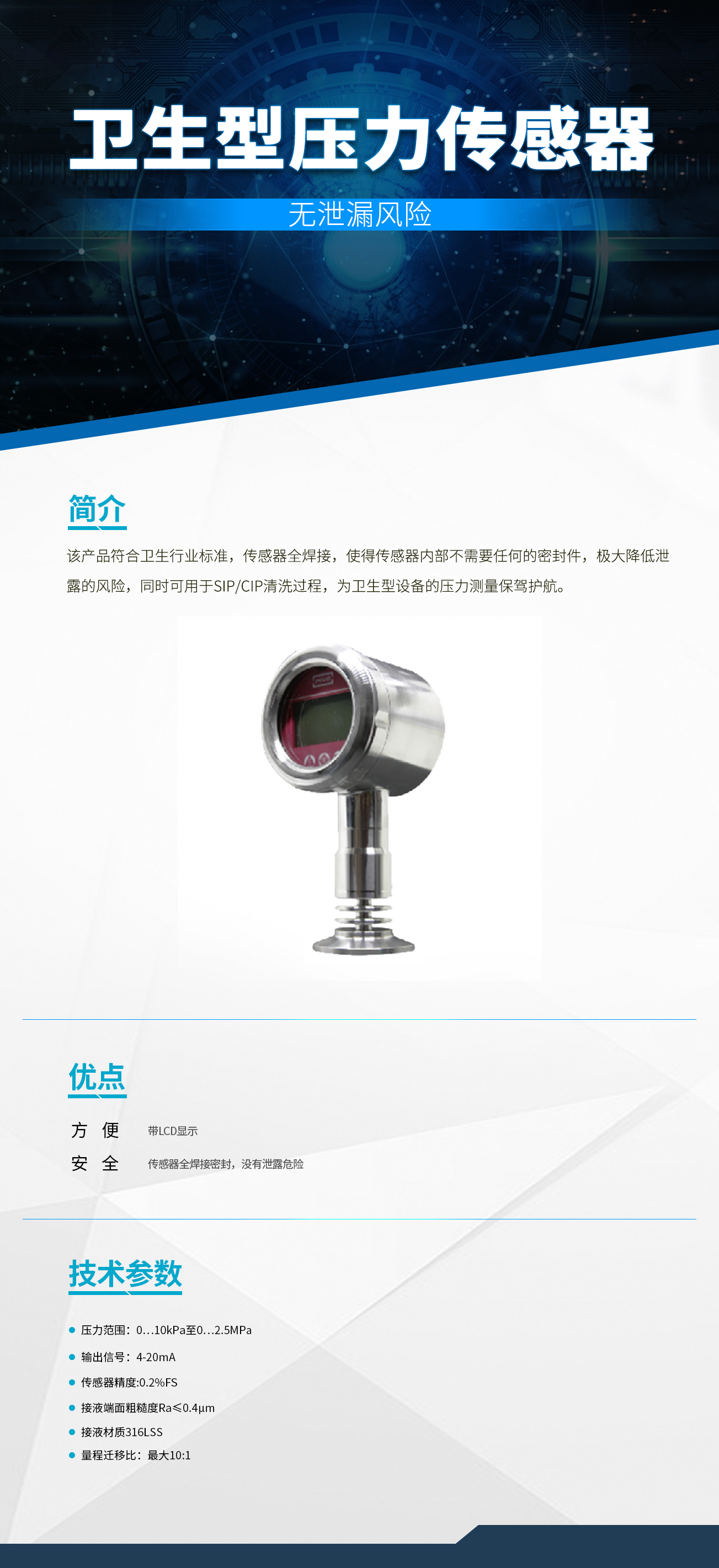 - 該產(chǎn)品符合衛(wèi)生行業(yè)標(biāo)準(zhǔn),傳感器全焊接,使得傳感器內(nèi)部不需要任何的密封件,極大降低泄露的風(fēng)險(xiǎn),同時(shí)可用于SIP/CIP清洗過(guò)程,為衛(wèi)生型設(shè)備的壓力測(cè)量保駕護(hù)航