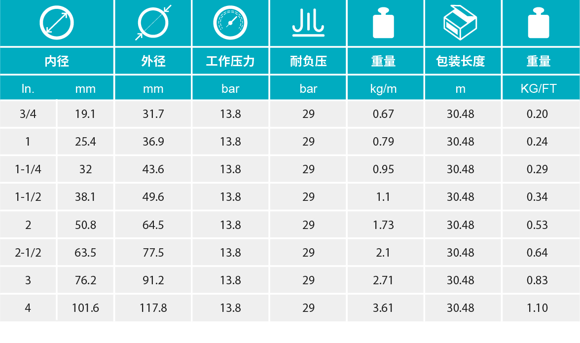 • 【外層】黑色Omegasyn ,具有耐磨損性的EPDM(三元乙丙橡膠),帶有白色螺旋纏繞帶