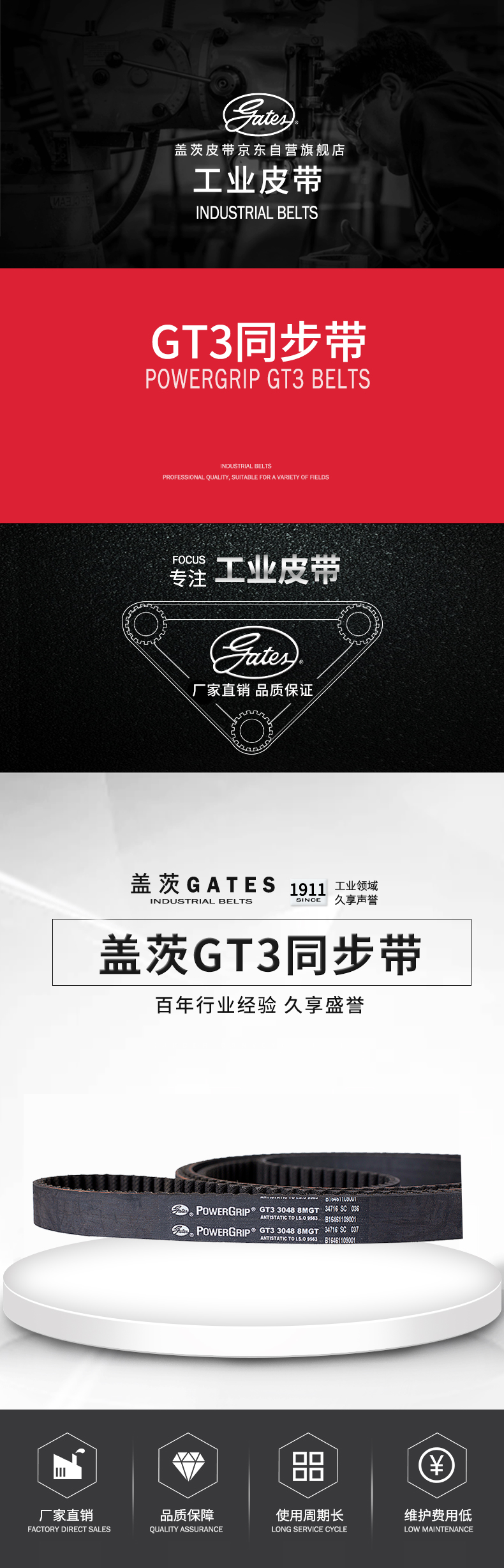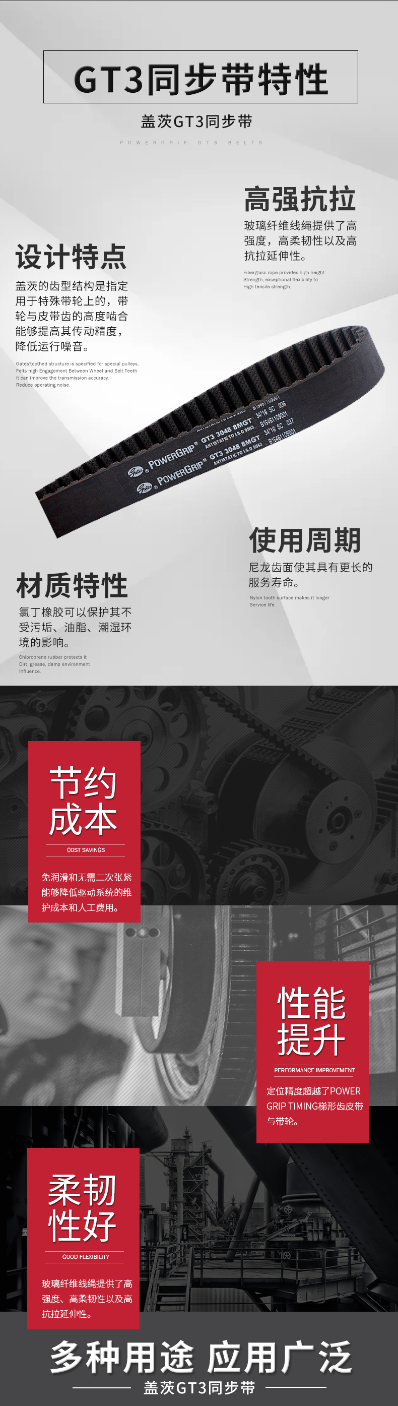 蓋茨的齒型結(jié)構(gòu)可和對應帶輪匹配,帶輪和皮帶齒的高度嚙合能夠提高其傳動精度,降低運行噪音。