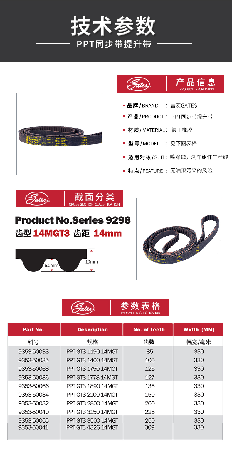 蓋茨GATES同步帶提升帶PowerPaint橡膠傳動帶PPT GT3 3500 14MGT