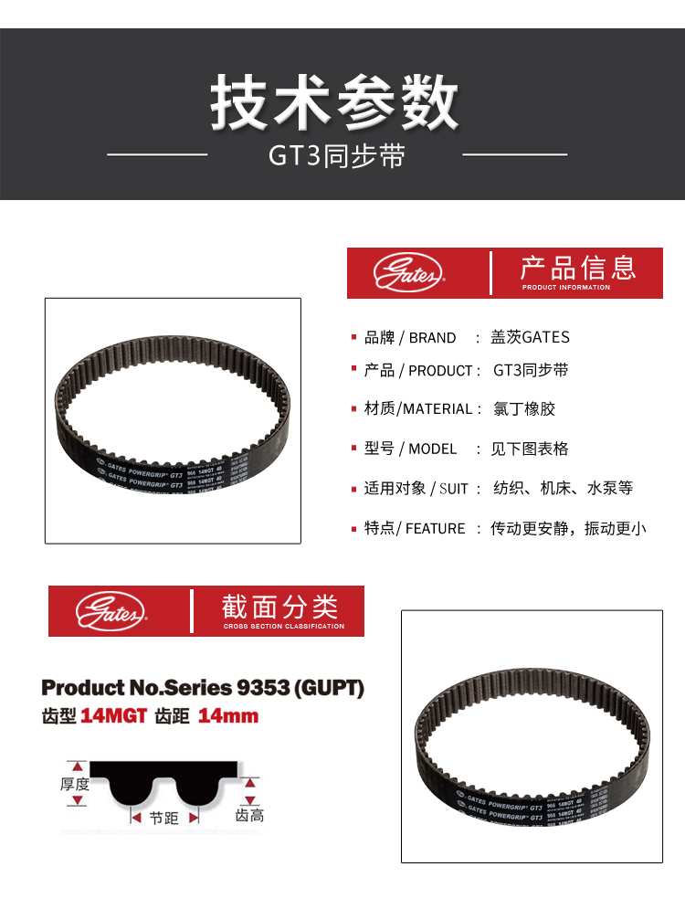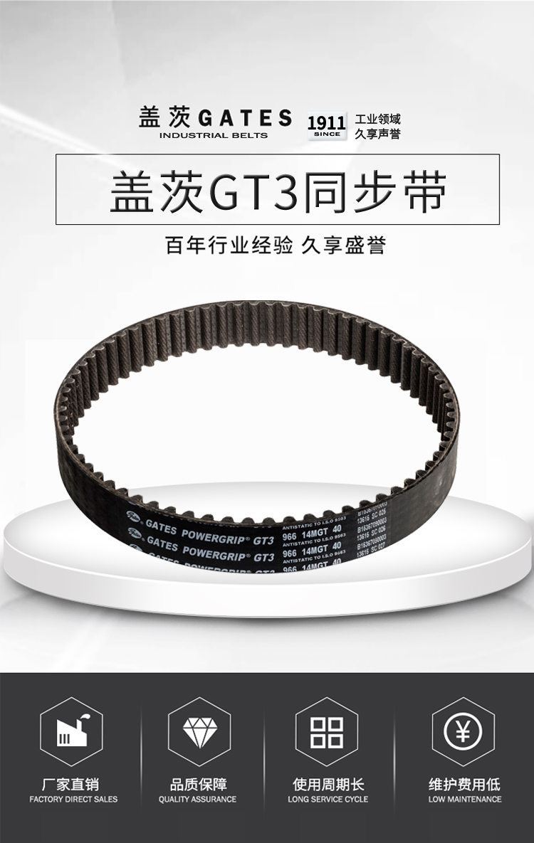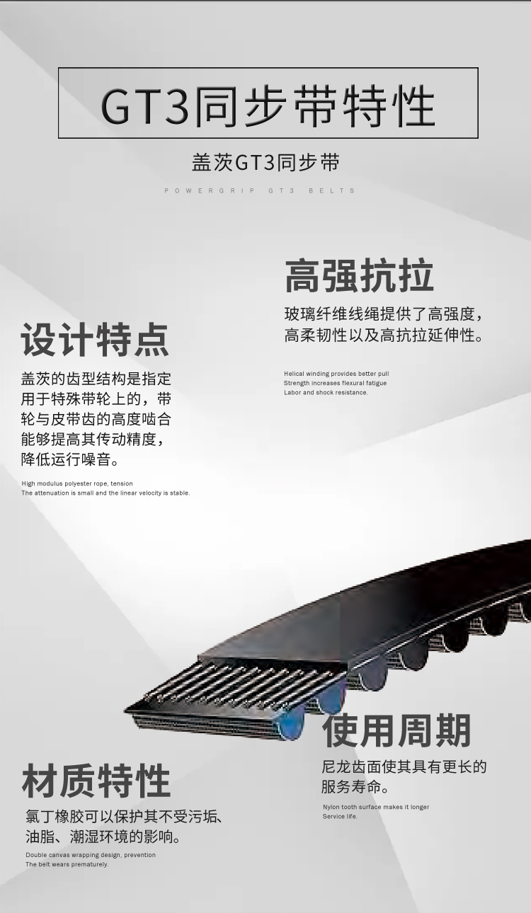 - 蓋茨的齒型結(jié)構(gòu)可和對應(yīng)帶輪匹配,帶輪和皮帶齒的高度嚙合能夠提高其傳動精度,降低運(yùn)行噪音。