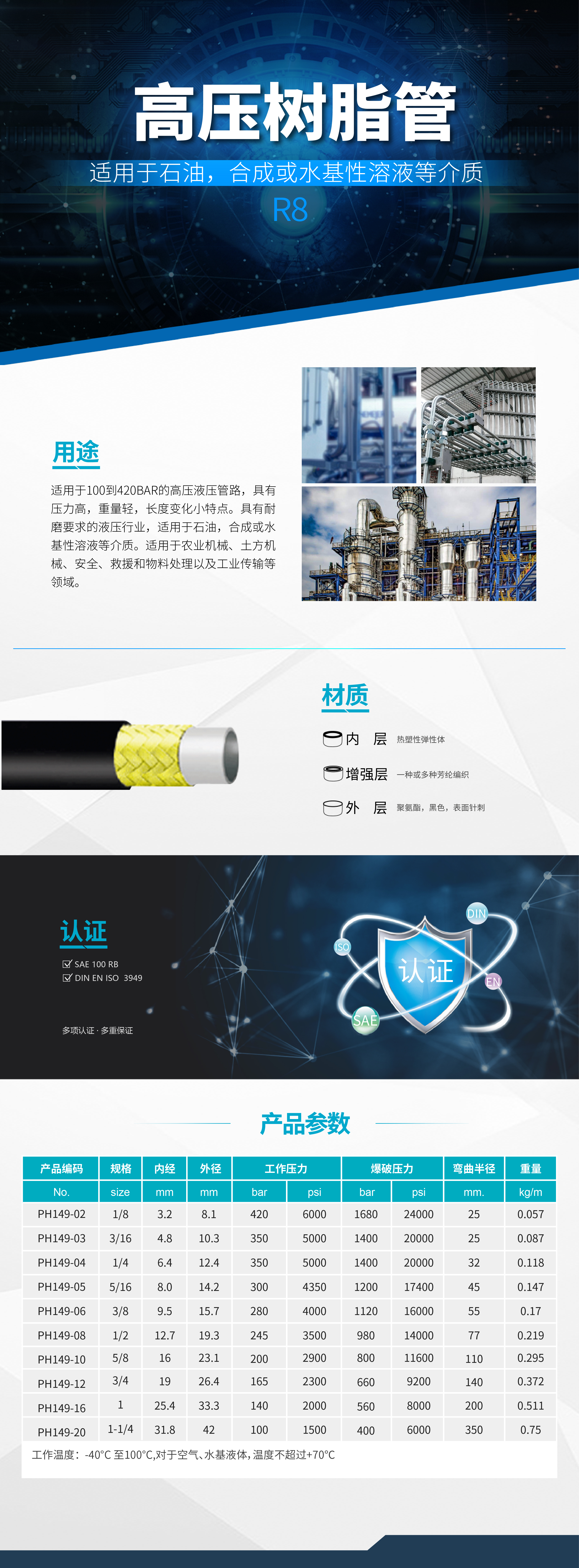 - 適用于100到420bar的高壓液壓管路,具有壓力高,重量輕,長度變化小等特點(diǎn)。具有耐磨要求的液壓行業(yè),適用于石油,合成或水基性溶液等介質(zhì)。適用于農(nóng)業(yè)機(jī)械、土方機(jī)械、安全、救援和物料處理設(shè)備以及工業(yè)氣體傳輸?shù)阮I(lǐng)域。