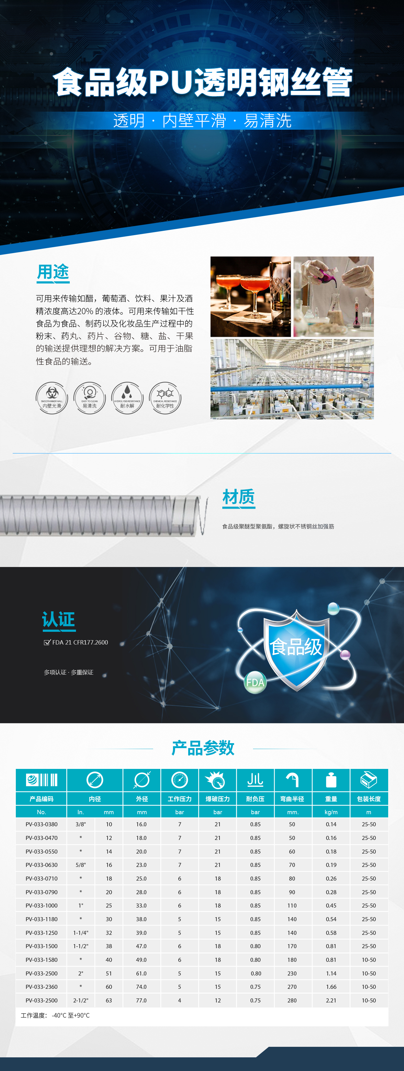 • 食品級(jí)聚醚型聚氨酯軟管,帶有螺旋狀不銹鋼絲加強(qiáng)筋
