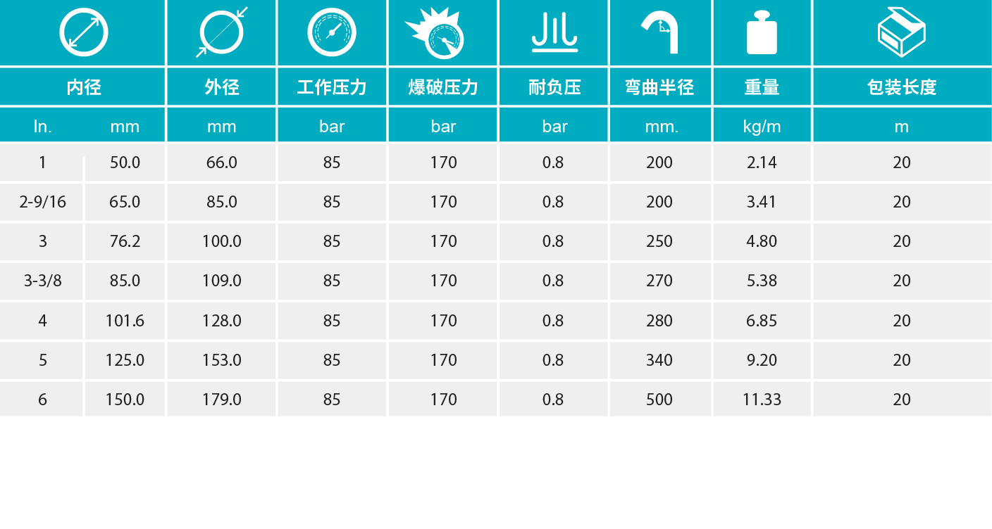 • 【增強層】ID=50mm 2層鋼絲纏繞,其他尺寸均為4層鋼絲纏繞