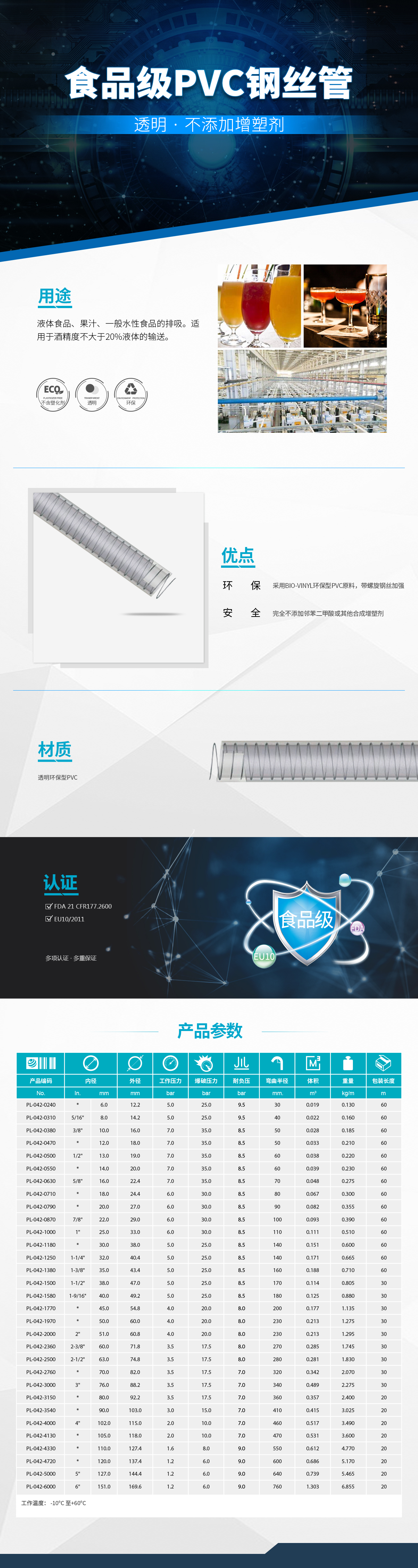 輸送軟管采用革命性的BIO-VINYL環(huán)保型PVC原料,帶螺旋鋼絲和高強度聚酯纖