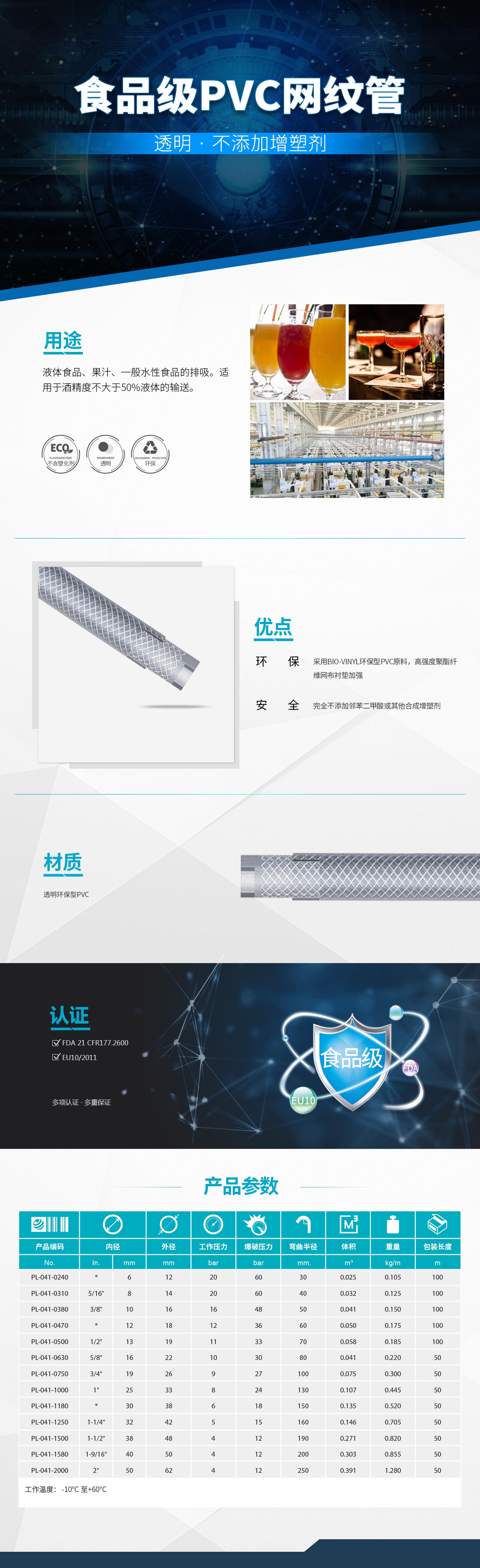 輸送軟管采用革命性的BIO-VINYL環(huán)保型PVC原料,由高強度聚酯纖維網布襯墊加強
