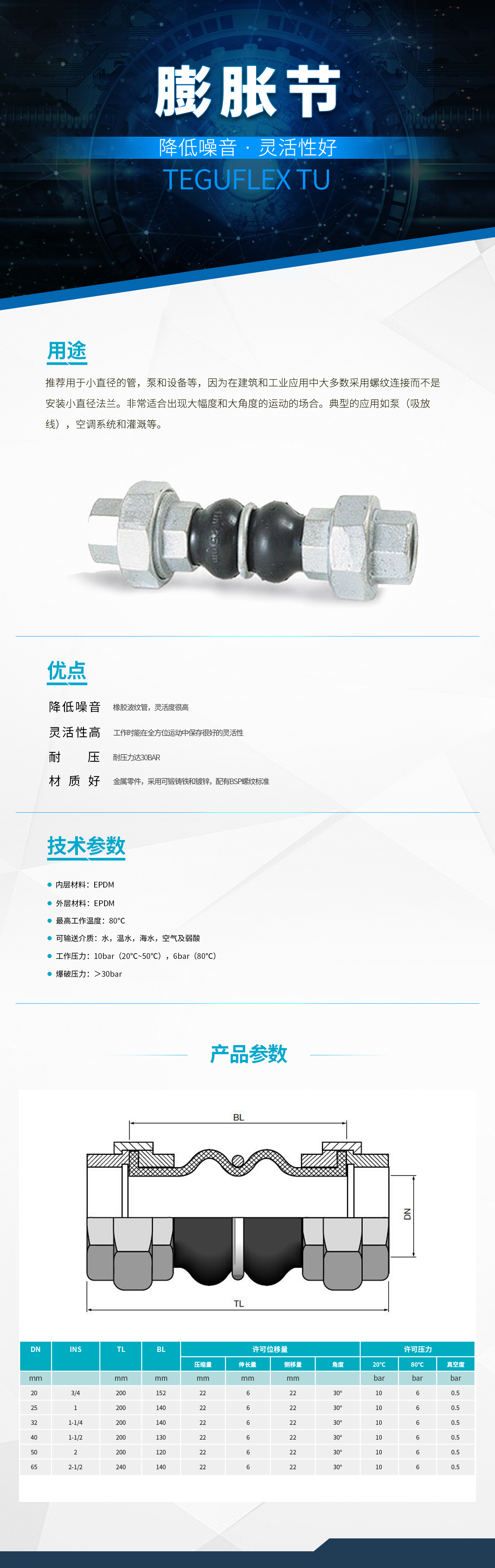 - 推薦用于小直徑的管,泵和設(shè)備等,因?yàn)樵诮ㄖ凸I(yè)應(yīng)用中大多數(shù)采用螺紋連接而不是安裝小直徑法蘭。非常適合出現(xiàn)大幅度和大角度的運(yùn)動的場合。典型的應(yīng)用如泵(吸放線),空調(diào)系統(tǒng)和灌溉等