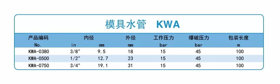 在此小編為大家推薦一款模具水管——KWA,該產(chǎn)品專為模具行業(yè)設(shè)計,具有長時間耐高溫(95-150℃)特性、良好的彎曲半徑(適應(yīng)安裝空間)、好的抗老化能力并且其規(guī)格可滿足多數(shù)模具冷卻系統(tǒng)的孔徑及水量要求。