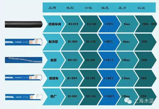 工廠內(nèi)工廠卸奶,衛(wèi)生級(jí)泵的前后端減震,儲(chǔ)罐轉(zhuǎn)運(yùn),車間清洗等,針對(duì)乳品工廠的復(fù)雜工況,我們擁有各類特性的軟管、接頭備件,我們的所有產(chǎn)品,均食品級(jí)認(rèn)證齊全,各類口徑均有備貨,其中A1-001,是針對(duì)乳品工廠輸送的享譽(yù)世界的方案,值得信賴。